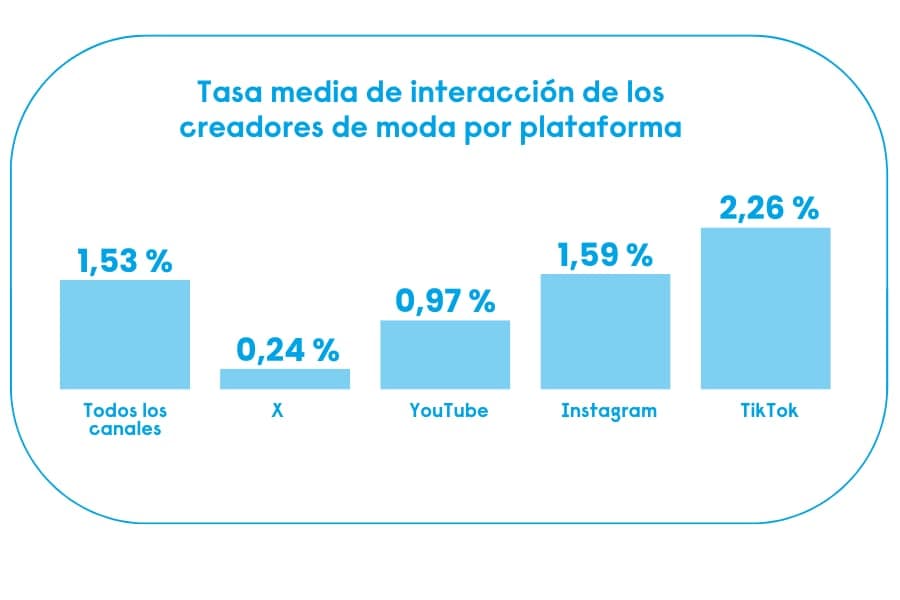 Los creadores de moda están consiguiendo un impresionante engagement en las redes sociales, entre las que destaca TikTok como la plataforma con mayor interacción. En comparación con la publicidad tradicional, las campañas de marketing de influencers forjan conexiones más fuertes y logran un mayor compromiso. De media, los creadores de moda consiguen un 1,53 % de interacción en todos los canales, con cifras notables como el 1,59 % en Instagram, el 2,26 % en TikTok, el 0,24 % en X (antes Twitter) y el 0,97 % en YouTube. En general, las campañas de marketing de influencers ofrecen una tasa media de interacción del 4,2 %, muy superior a la de los métodos publicitarios tradicionales.