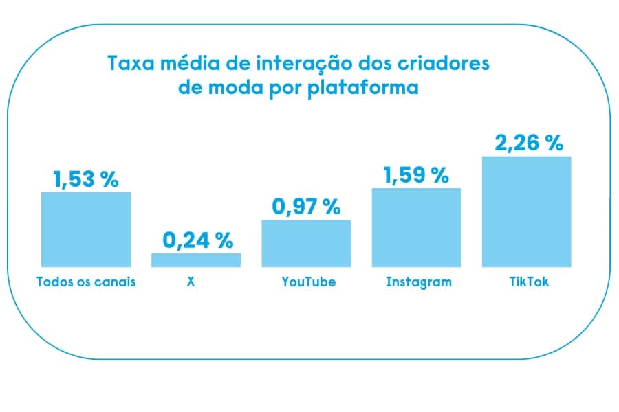 Os criadores de moda estão a conseguir um envolvimento impressionante nas redes sociais, com o TikTok a destacar-se como a plataforma com maior interação. Em comparação com a publicidade tradicional, as campanhas de marketing de influenciadores criam ligações mais fortes e alcançam um maior envolvimento. Em média, os influenciadores atingem 1,53% de envolvimento em todos os canais, com valores notáveis que incluem 1,59% no Instagram, 2,26% no TikTok, 0,24% no X (antigo Twitter) e 0,97% no YouTube. No geral, as campanhas de marketing de influenciadores apresentam uma taxa média de envolvimento de 4,2%, muito superior à dos métodos de publicidade tradicionais.